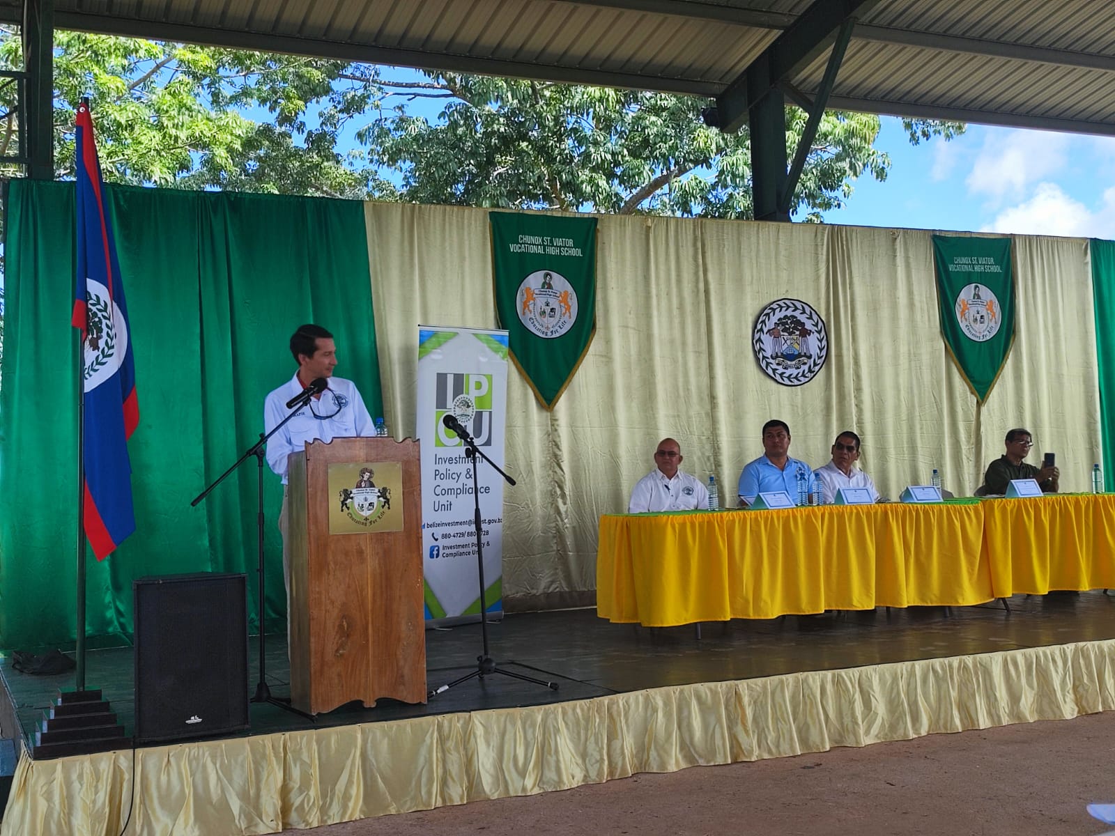 Thirteen students were awarded certificates in tilapia husbandry by Hon. Florencio Marin Jr., Minister of Rural Transformation, Community Development, Labour and Local Government, and Mr. Michael Sosa, Director of the Aquaculture Unit in the Ministry of Agriculture, Food Security and Enterprise. Also present at the inauguration were Mr. Lincoln Blake, Director of the Investment Policy and Compliance Unit (IPCU) in the Ministry of Investment; Mr. Marconie Moh, Principal; Mr. Francisco Magaña, Chairman of the Board of Directors of St. Viator Vocational High School; and Mr. Juan Carlos Menzies, the Managing Director of Caracol Architectural Designs, who assisted with tank construction.